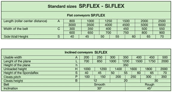 Flat and inclined conveyors with lateral sides type SpondaflexTechnical Data